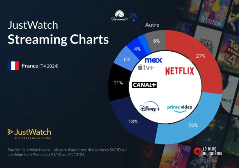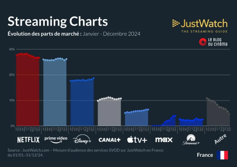 Acteur majeur du streaming : Netflix conserve son titre de roi incontesté du streaming en France, suivi de près par Prime Video, avec un écart de seulement 1 %. À la troisième place, Disney+ reste un concurrent solide avec une part de marché supérieure à celles de Canal+ et Apple TV+ réunies.