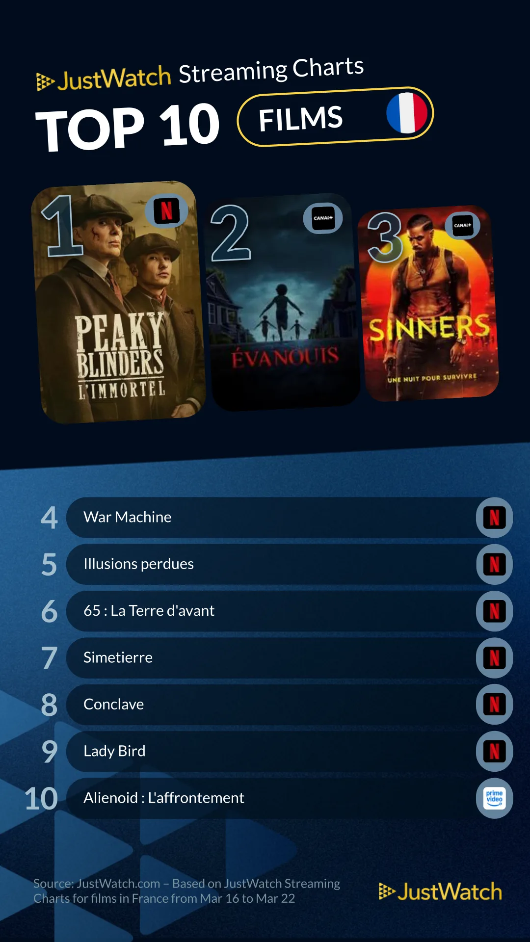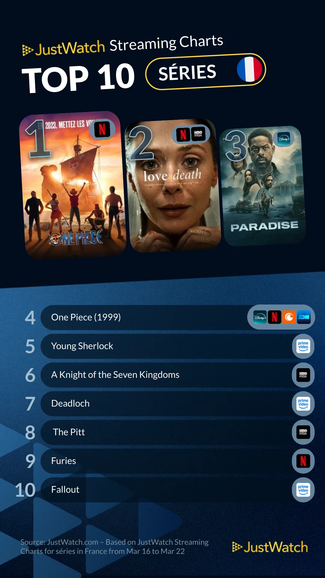 Chaque semaine, JustWatch compile les titres les plus recherchés par les spectateurs français. Ce classement dit souvent quelque chose de l’air du temps – ce que les gens ont envie de voir, ce qu’ils attendent, ce qui les retient. Voici ce qui domine du 16 au 22 mars 2026.
