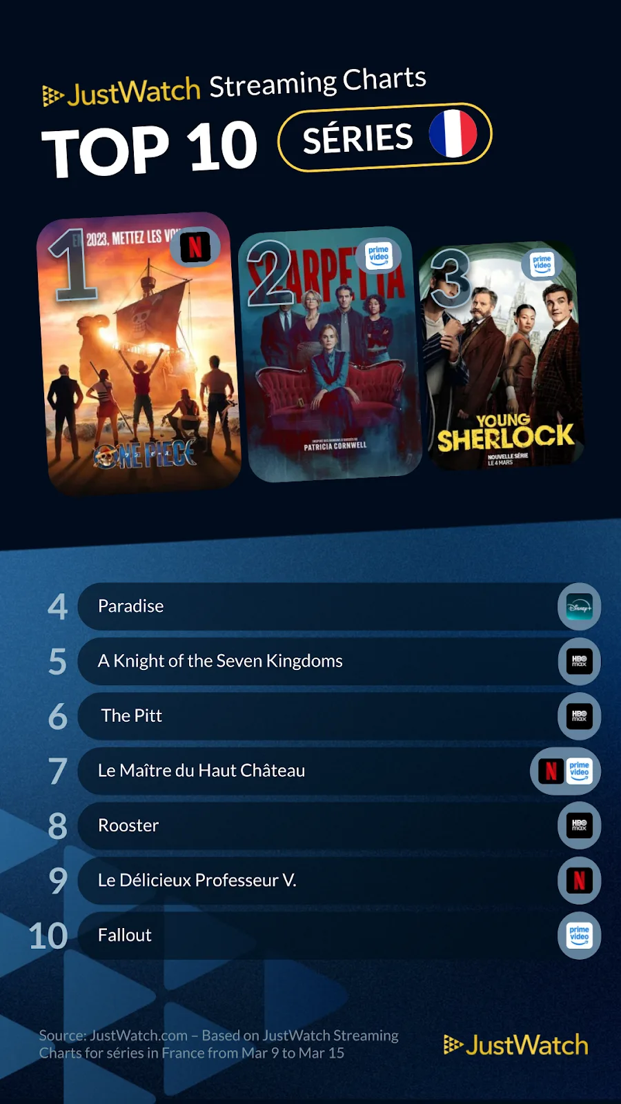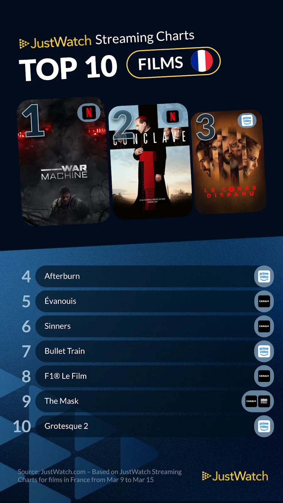 Entre confirmations et nouvelle prise de pouvoir, le classement JustWatch du 9 au 15 mars dessine une semaine de streaming très contrastée en France. Côté films, War Machine conserve la première place devant Conclave et Le Corps Disparu. Côté séries, One Piece reprend la tête, suivi de Scarpetta et Young Sherlock. Un top 10 qui mêle satire politique, thriller religieux, polar tendu et grandes machines d’aventure populaire.
